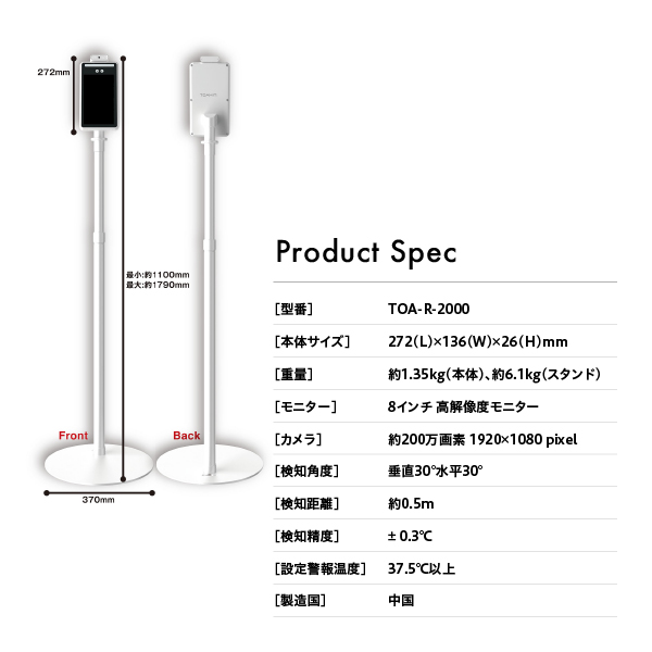 - AIカメラが顔を自動認識し、瞬時に表面温度を検知。